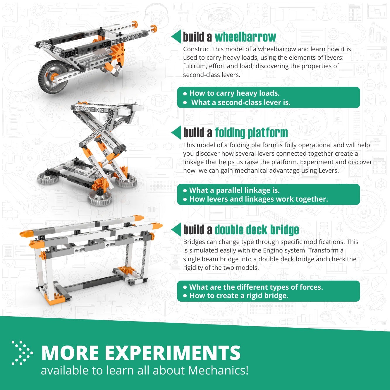 Κατασκευάστε 8 λειτουργικά μοντέλα εκκεντροφόρων και στροφάλων, όπως γερανό αλιείας, αντλία πετρελαίου, κινούμενη φιγούρα, κινητή γέφυρα, ραπτομηχανή και έναν αετό που πετάει. Μπορείτε να βρείτε εύκολες οδηγίες κατασκευής για όλα τα μοντέλα είτε διαδικτυακά είτε στο περιλαμβανόμενο εγχειρίδιο. Το εγχειρίδιο παρέχει λεπτομερείς εξηγήσεις των διαφορετικών επιστημονικών αρχών που εφαρμόζονται και ενσωματώνει καινοτόμες πειραματικές δραστηριότητες για μάθηση μέσω της πράξης. Διατίθεται επίσης ενότητα Quiz για να δοκιμάσετε τις νέες γνώσεις σας!