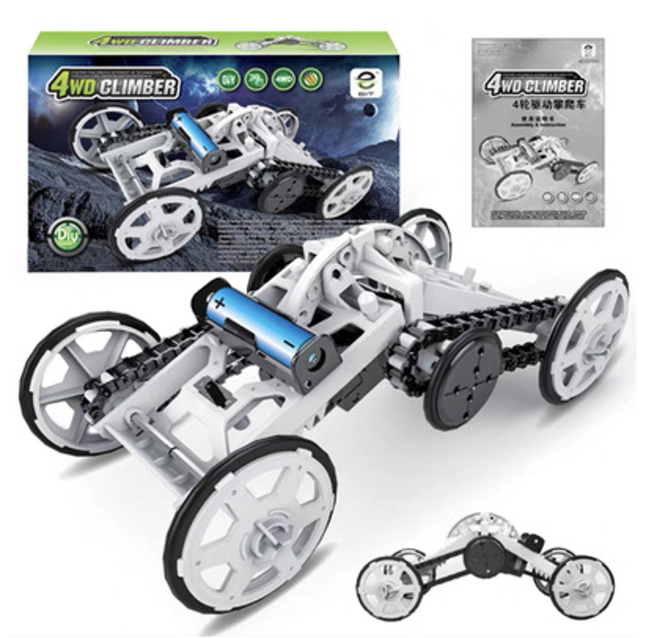 Ένα κιτ συναρμολόγησης ενός μοντέλου 4WD που φαίνεται να περπατά καθώς οι 4 τροχοί στις γωνίες του κινούνται κάθετα και σκαρφαλώνει πάνω από εμπόδια έως και 50 mm με ευκολία.