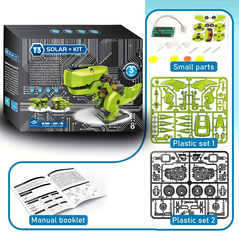 Робот диносаурус има фотонапонске панеле који сакупљају соларну енергију и претварају је у електричну енергију. Ова енергија се складишти у батеријама и користи за покретање мотора и електронике робота. Робот се може програмирати да изводи различите покрете, као што су ходање, махање репом или отварање уста.