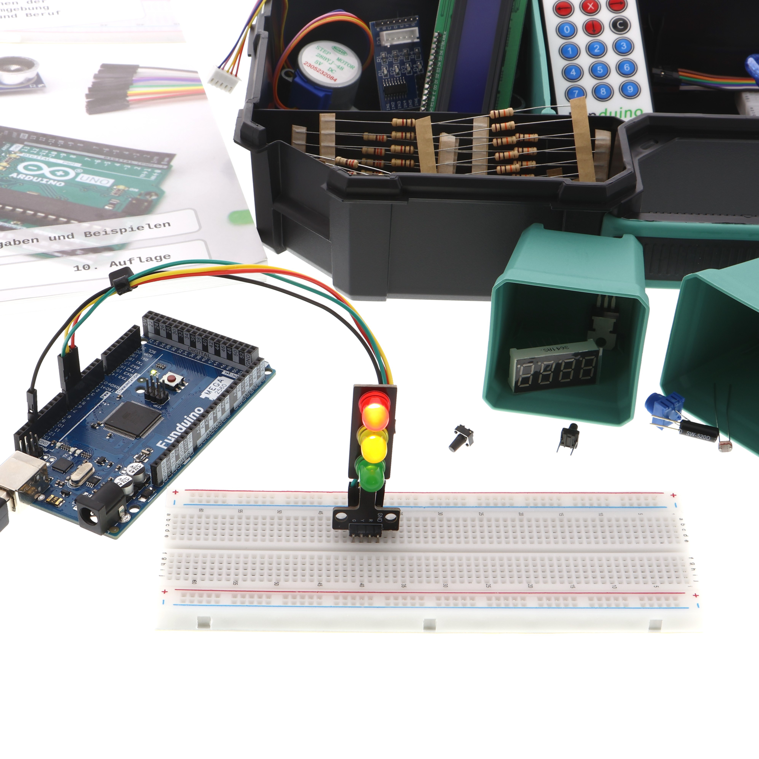 Benzersiz özelliği: Her kit, "ARDUINO lernen – Arduino Entwicklungsumgebung Çalışma Kitabı"nın bir kopyasıyla birlikte gelir. 130'dan fazla sayfa ve 29 projede, kitin tüm elektronik bileşenleri ayrıntılı olarak açıklanmaktadır. Bileşenler hakkında bilgi vermenin yanı sıra, malzeme listesi, devre şemaları ve örnek programlar da içerir.